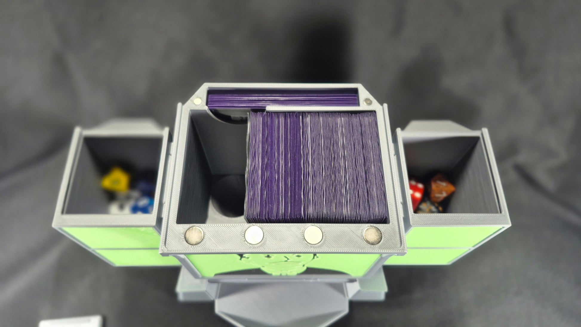 This terminal-themed design holds 100 double-sleeved cards, with extra space for tokens and counters, and features a built-in dice tower so you can roll right through the slot in the front. Each side includes two detachable dice trays, and the base comes fitted with rubber bumpers for a stable tabletop grip.