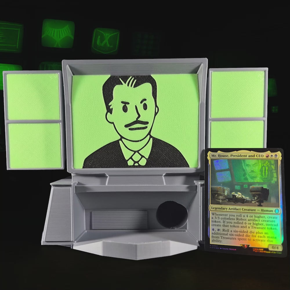 The Mr. House Deck Box & Dice Tower combines retro Fallout style with full tabletop functionality — part collectible, part game-ready tool.